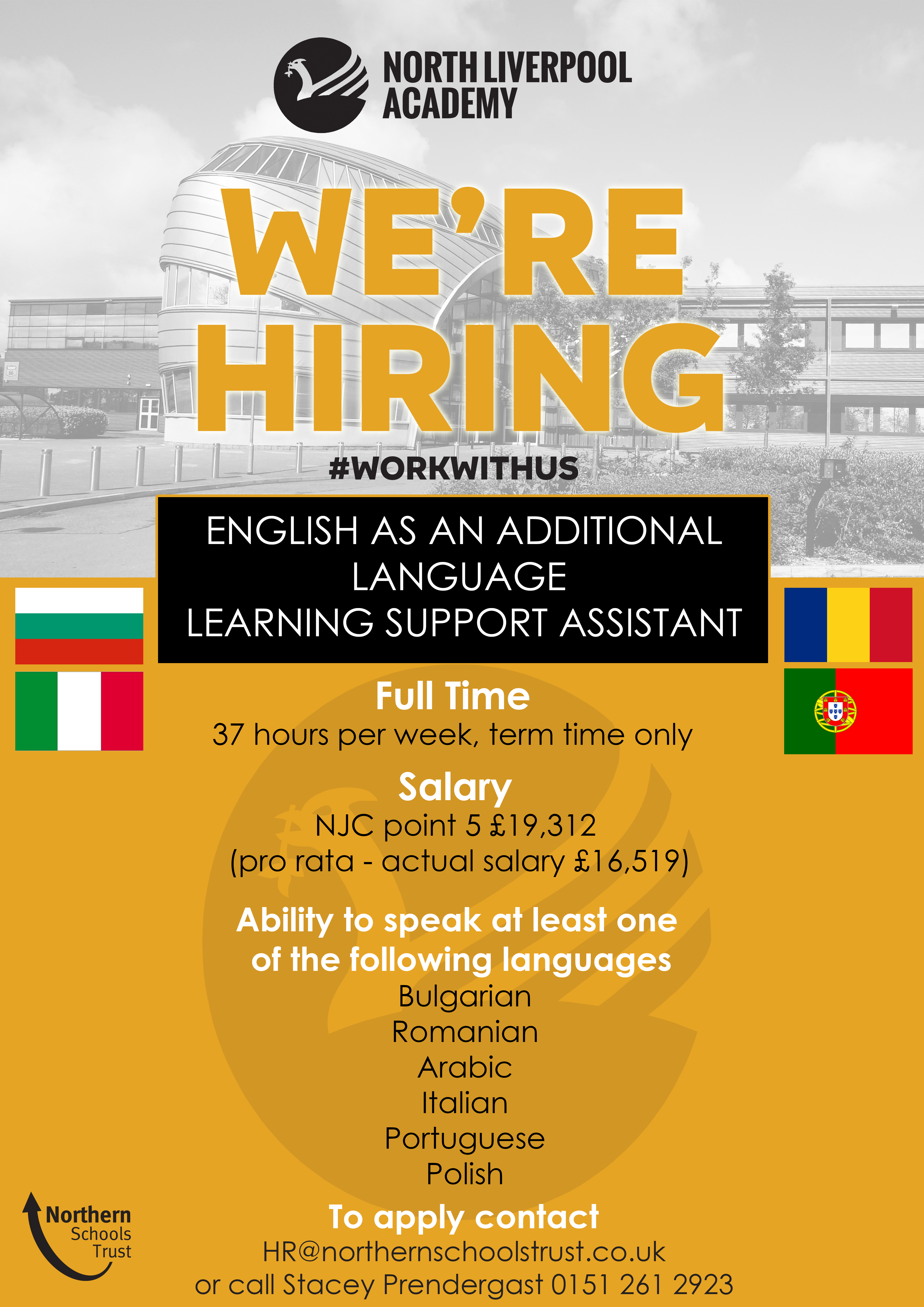 North Liverpool Academy is an inclusive community school with over 40 different first languages being spoken by students. In order for us to fully support our students, we are hiring an additional EAL Learning Support Assistant to work with our diverse student population.